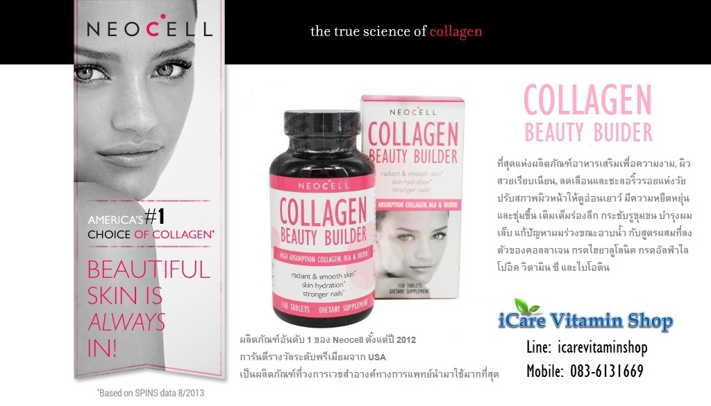 ที่สุดแห่งผลิตภัณฑ์อาหารเสริมเพื่อความงาม, ผิวสวยเรียบเนียน ผลิตภัณฑ์ลดเลือนและชะลอริ้วรอยแห่งวัย ปรับสภาพผิวหน้าให้ดูอ่อนเยาว์ มีความหยืดหยุ่นและชุ่มชื้น เติมเต็มร่องลึก กระชับรูขุมขน บำรุงผม เล็บ แก้ไขปัญหาได้กับผมร่วงขณะอาบน้ำ กับสูตรผสมที่ลงตัวของคอลลาเจน กรดไฮยาลูโลนิค กรดอัลฟ่าไลโปอิค วิตามิน ซี และไบโอติน ถือว่าเป็นสินค้าตัว Top อันดับ 1 ของ Neocell Corp.ตั้งแต่ปี 2012 การันตีรางวัลระดับพรีเมียมจาก USA เป็นผลิตภัณฑ์ที่วงการเวชสำอางค์ทางการแพทย์นำมาใช้มากที่สุด